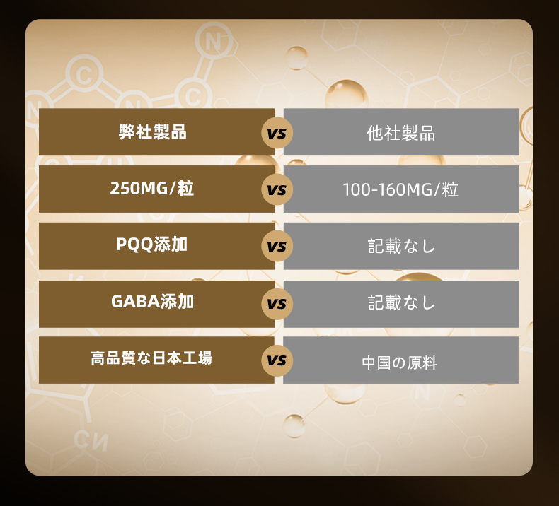 ニコチンアミドモノヌクレオチド、デキストリン、コエンザイムQ10、殺菌乳酸菌粉末(デキストリン、殺菌乳酸菌原末)、トランスレスベラトロール、ホスファチジルセリン、ピロロキノリンキノン二ナトリウム塩、ビタミンE、ビタミンC/HPMC、ステアリン酸Ca、酸化チタン
